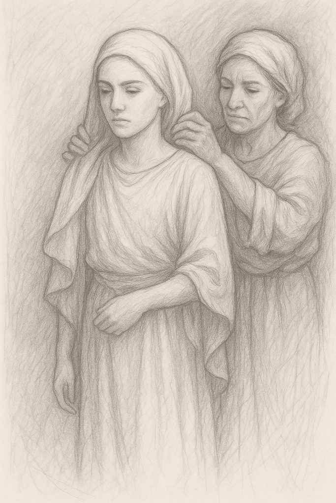 Le rasoir glissait lentement sur son crâne. La servante asserve avait des gestes précis, presque solennels. On avait étendu un drap jaune sur ses épaules, la couleur du deuil sur Velum. Elle ne bougeait pas, les yeux ouverts, fixant un point invisible dans l’air, comme si elle regardait au travers du mur.