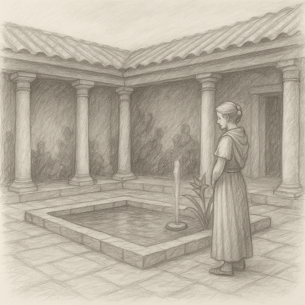 Au centre de la cour, le bassin central, peu profond, captait un filet d’eau venu directement d’une source toute proche. Le clapotis irrégulier de la petite fontaine incitait au calme. Quelques plantes aquatiques, grandes feuilles lancéolées et fleurs orangées teintées de rouge, occupaient un angle du bassin. Le portique à colonnes courait tout le long de la cour, offrant une ombre bienvenue. Les murs enduits d’un pigment blanc dégageaient une odeur mêlée de poussière sèche et de savon.