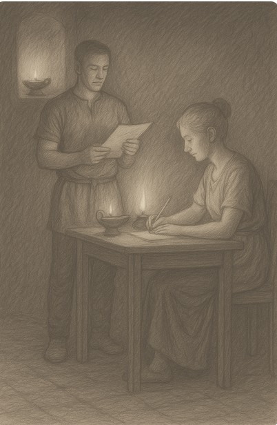 La nuit tombait doucement sur Lysna. Un parfum de feu de bois flottait dans l’air, mêlé à celui des herbes que Valia faisait sécher en bouquets suspendus sous le portique. Dans le bureau, les lampes à huile projetaient leur lumière. La pièce sentait la cire et la laine.