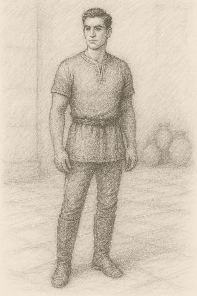 Le cousin arriva à la troisième heure après midi, en litière, une charrette le suivait. Il descendit prestement. Il était beau, évidemment. Brun, élancé, les traits fins, les mains impeccables. Il portait une tunique de laine fine, rehaussée d’un galon d’or pâle qui s’accordait parfaitement avec son pantalon.